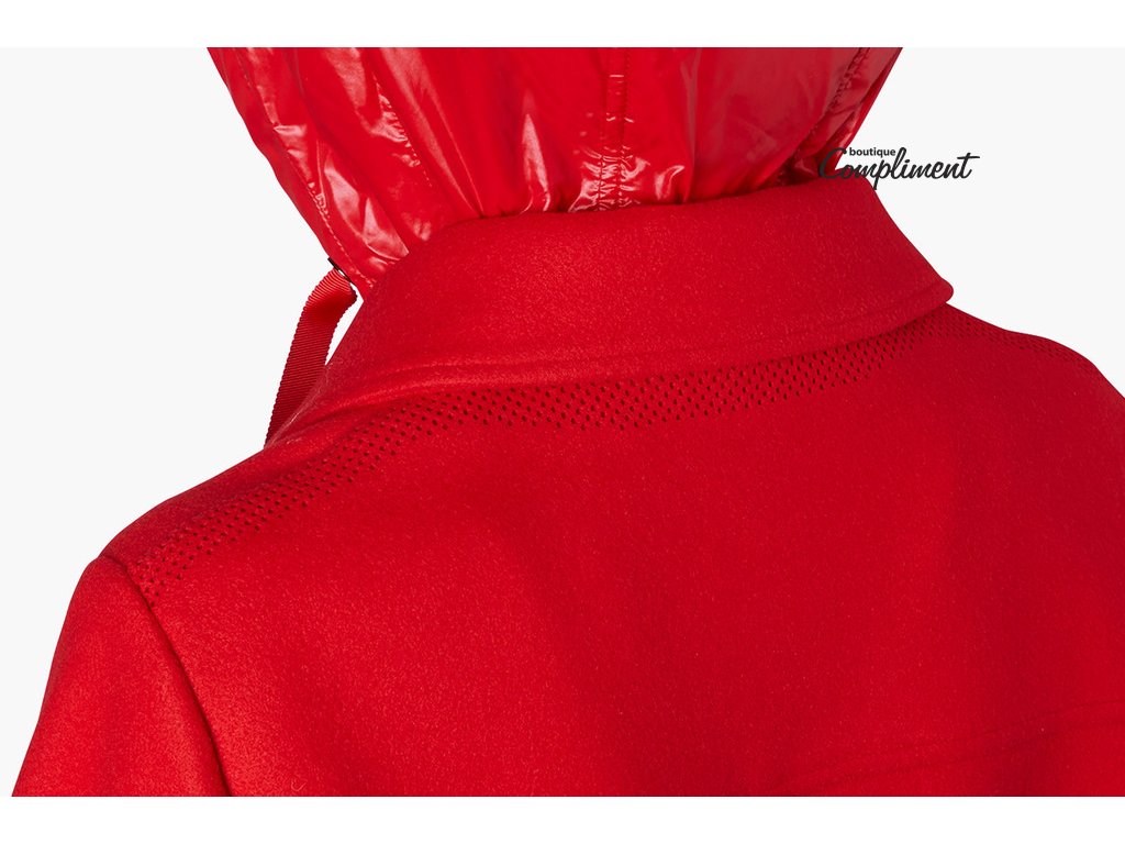 Jednoduchý kabát s klopami doplňuje prošívaná kapuce, kabát má nakládané kapsy a zapínání na kontrastní knoflíky, v bocích rozparky. Je bez podšívky, do větší zimy pod něj můžete obléknout třeba prošívanou vestu:-). V jasné červené budete nepřehlédnutelná, jemné praní. Italské číslování!