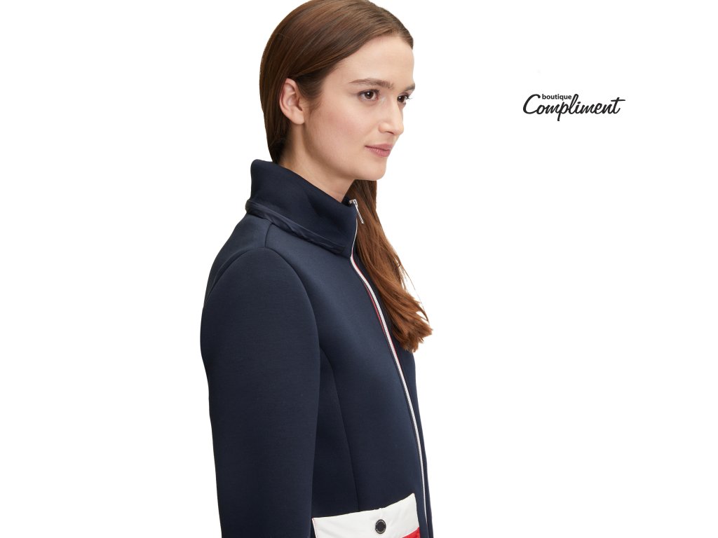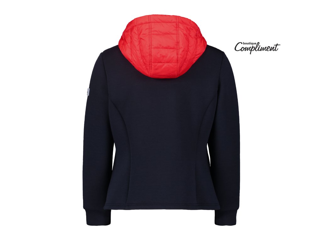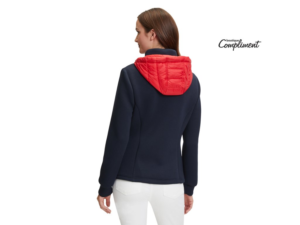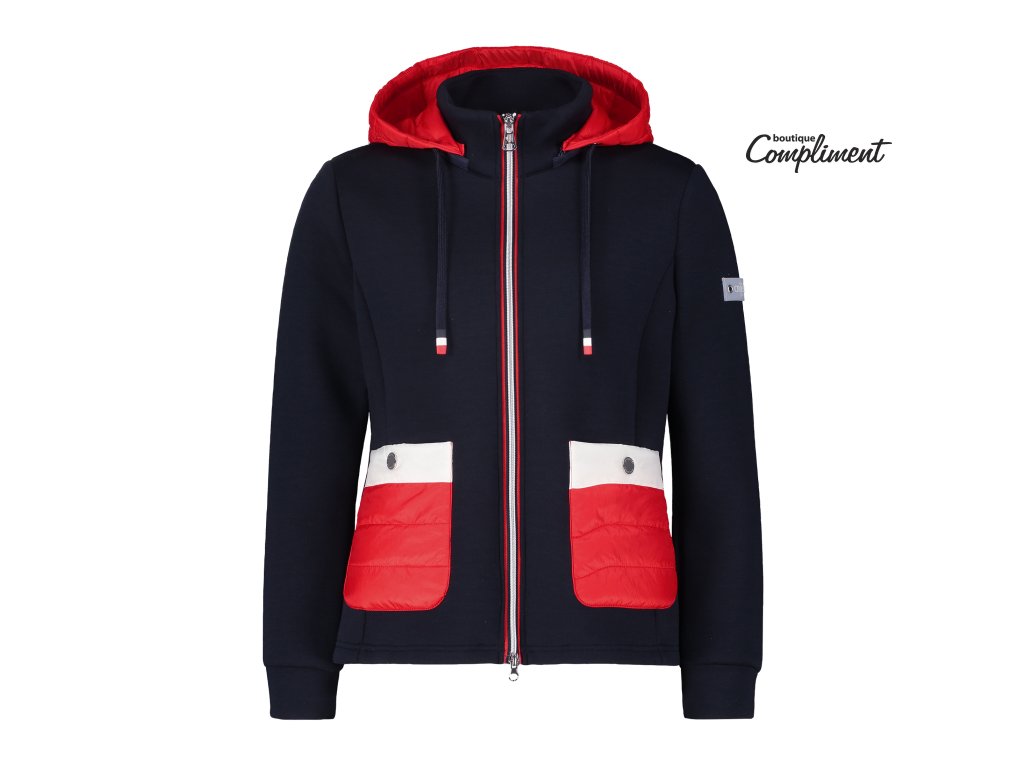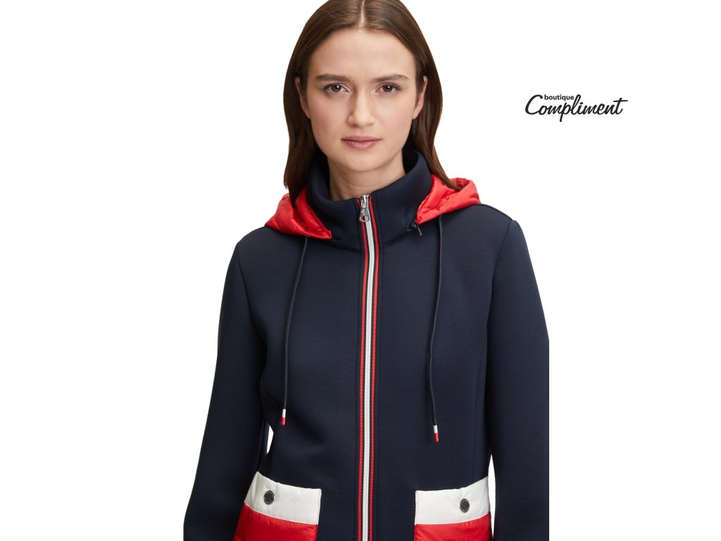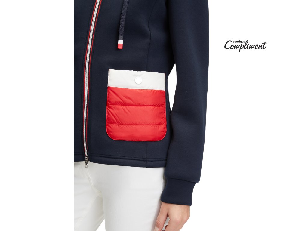 Přechodová bunda - mikina má "neoprénový" základ, který zdobí zapínání na elegantní střírbný zip. Model v národních barvách má nakládané kapsy a odepínací kapuci ze šusťákového materiálu. Prací.