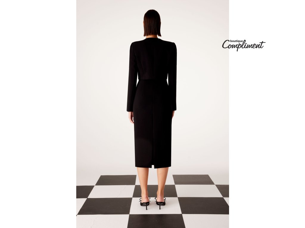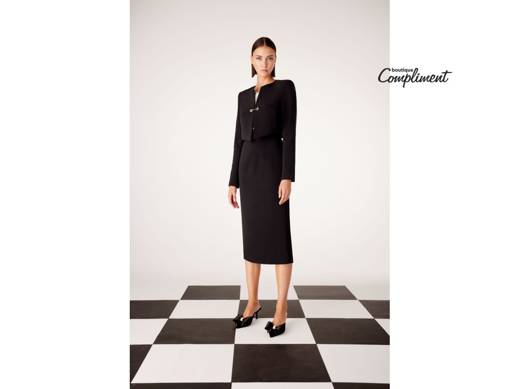 Vypodšívkované krátké společenské sako bez fazóny, dlouhé rukávy. Zapínání ozdobným stříbrným řetízkem.