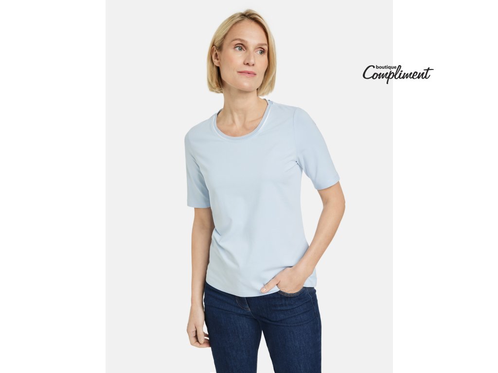 Jednoduché basic triko s krátkým rukávem. Kulatý výstřih zdobí saténový proužek se žoržetovou výpustkou.