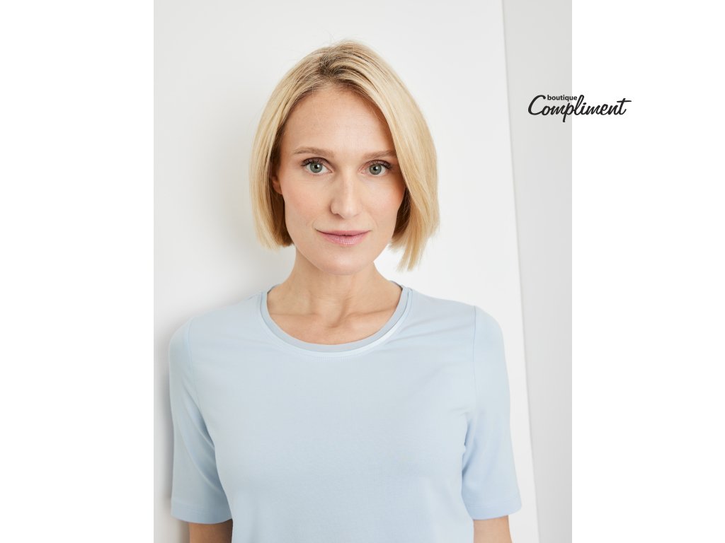 Mírně tvarované tričko má krátké rukávy s ohrnkou a kulatý výstřih s légou. Vpředu jej zdobí modrá aplikace pošitá pajetkami a korálky.
