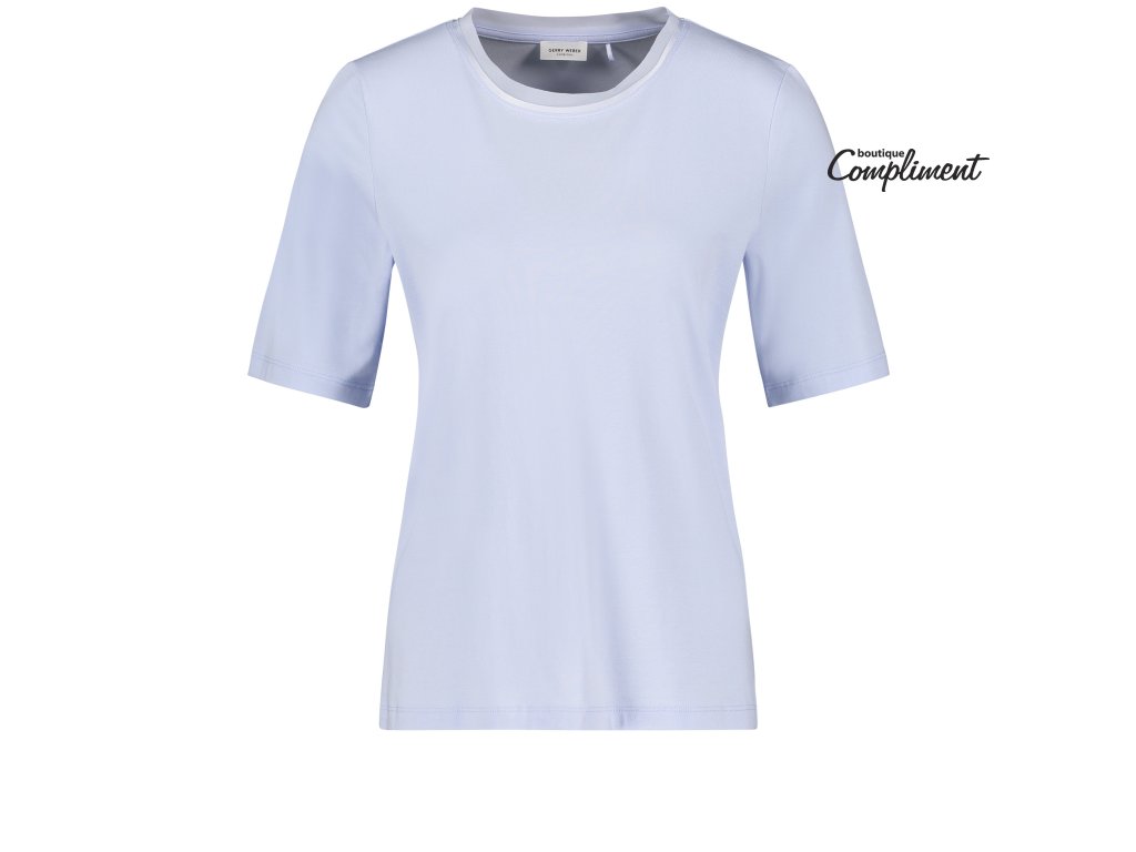 Basic triko s krátkým rukávem má široký žebrovaný lem kolem oblého výstřihu.