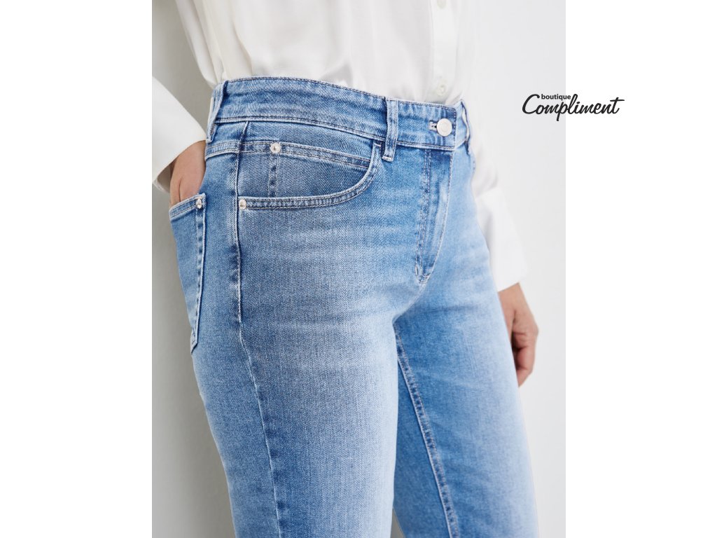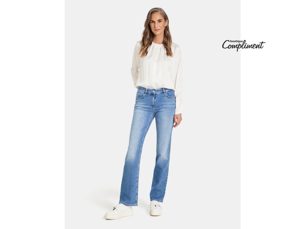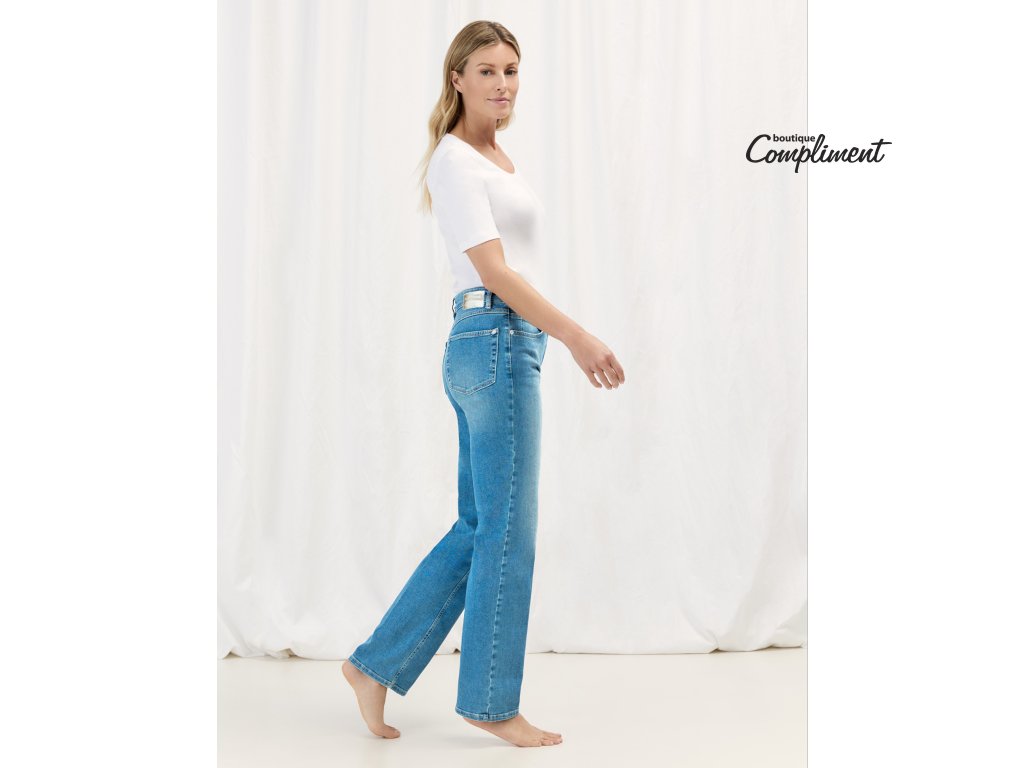 Měkké klasické jeansy střední modré s decentním sepráním mají rovné dlouhé nohavice.