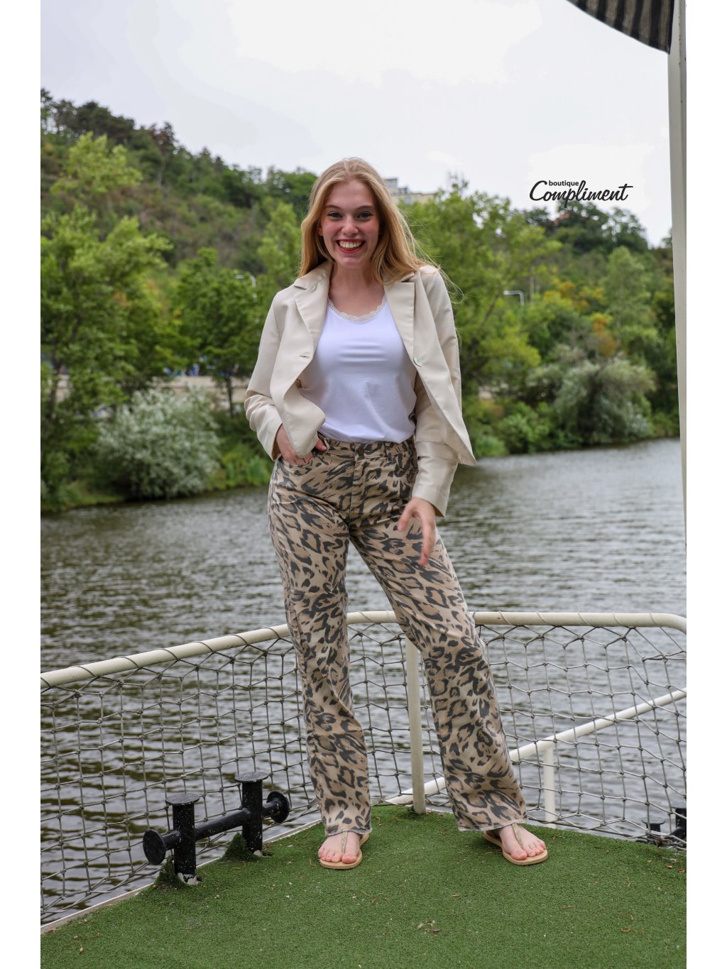 7/8 kalhoty s rovnými nohavicemi jsou ze strečového jeansového materiálu s leopardím potiskem. Klasický jeansový střih zdobí nýtky na kapsách a třepení v délce.