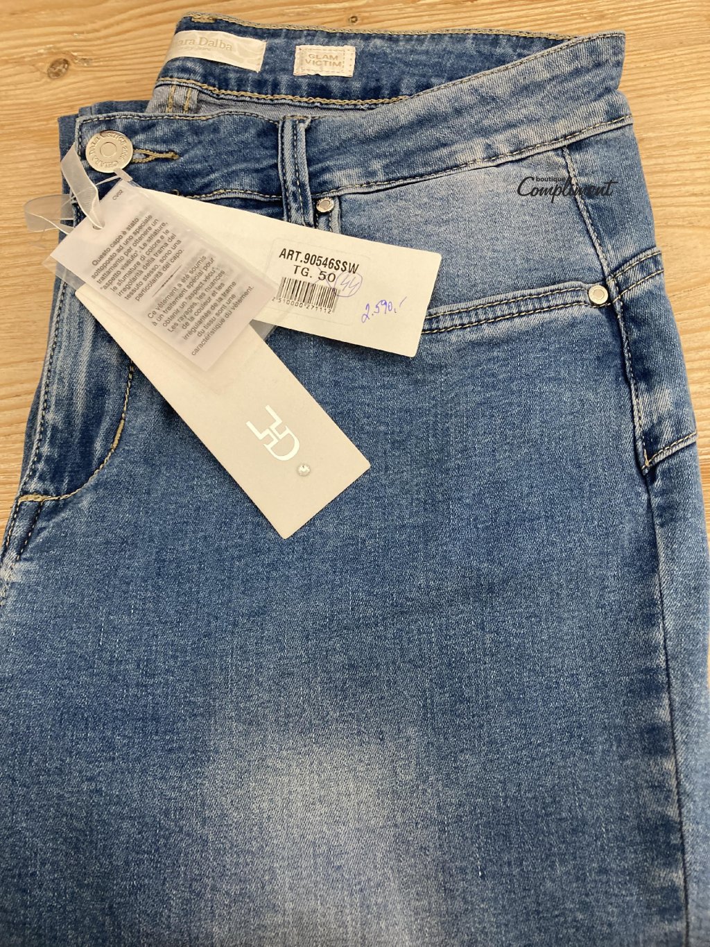 Měkké strečové jeans kalhoty s mírným vyšoupáním na stehnech zn. Chiara Dalba mají nakládané kapsy s ozdobou na zadních dílech a zúženou nohavici.