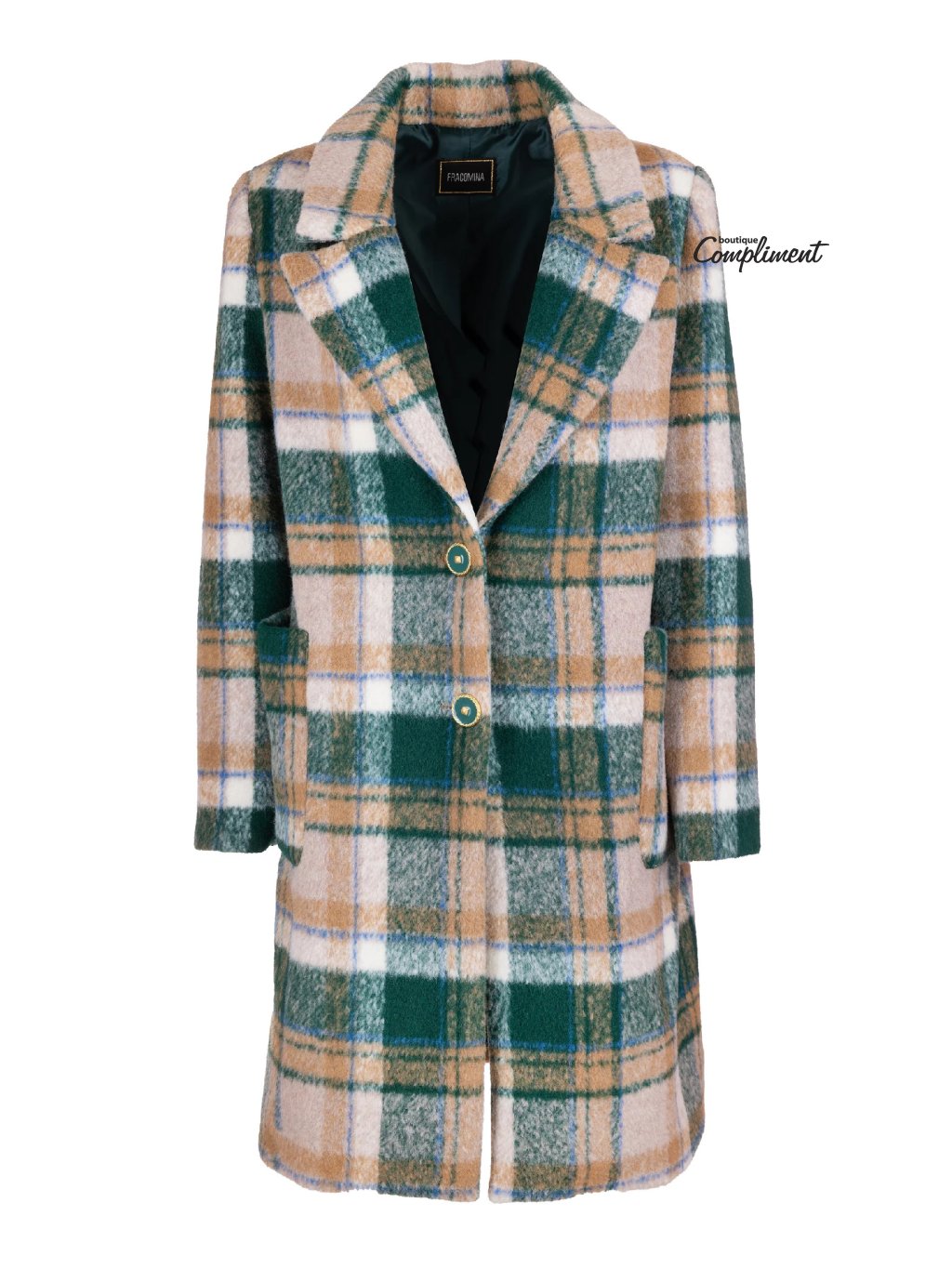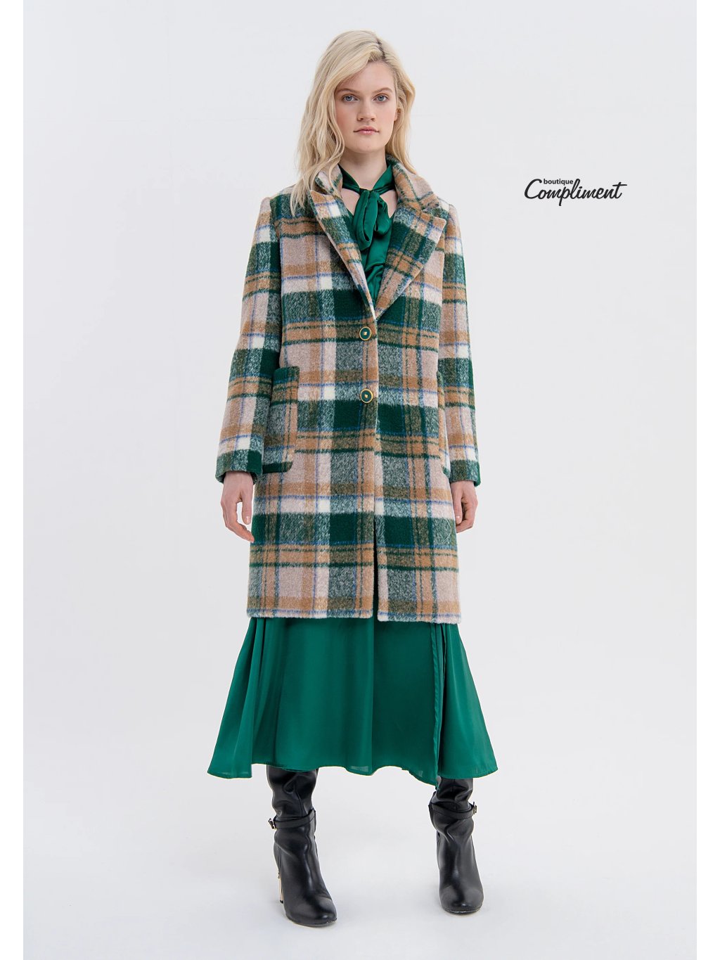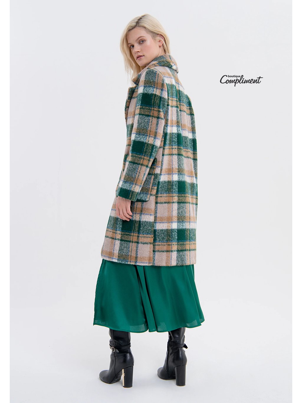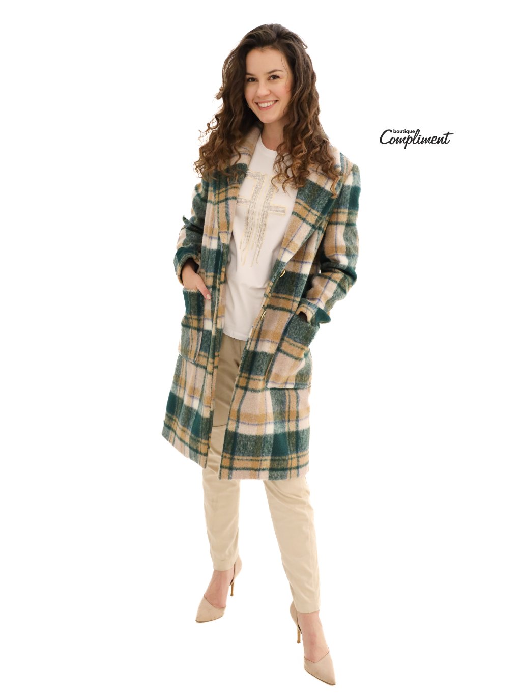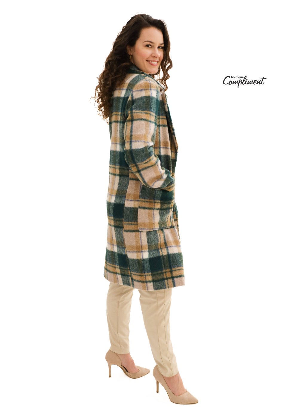 Výrazná velká kostka v béžovo zelené kombinaci na počesaném materiálu. Trendy kabátek má klasické klopy, nakládané kapsy a zapínání na 2 knoflíky.