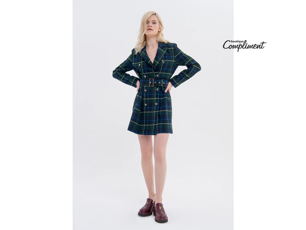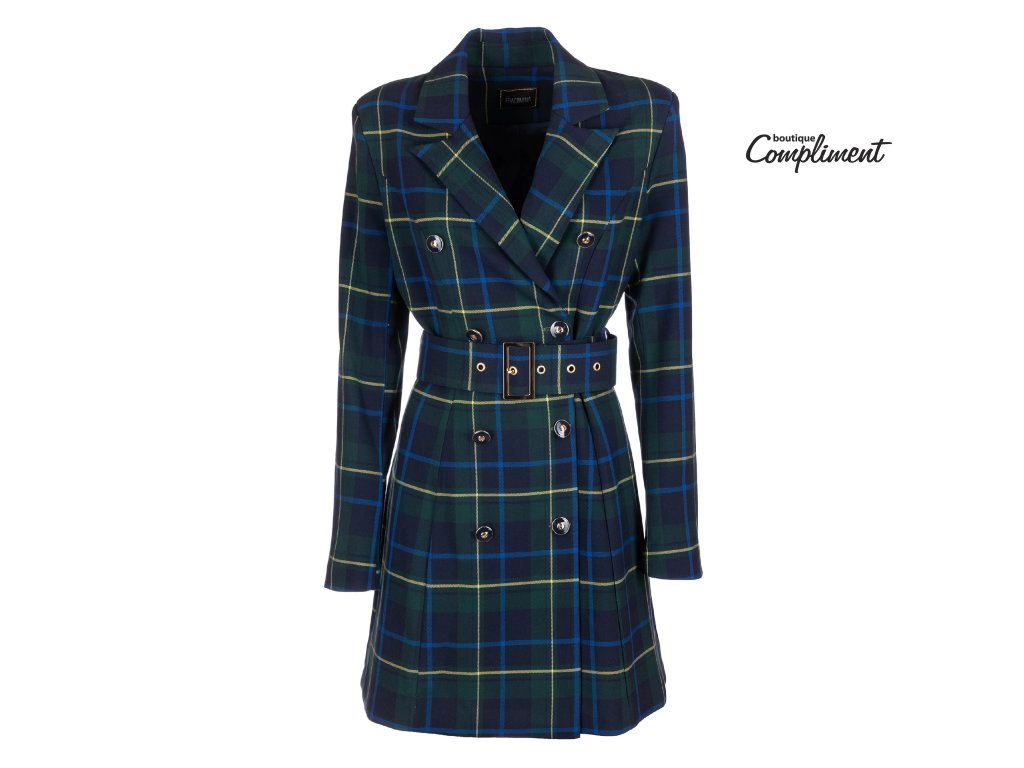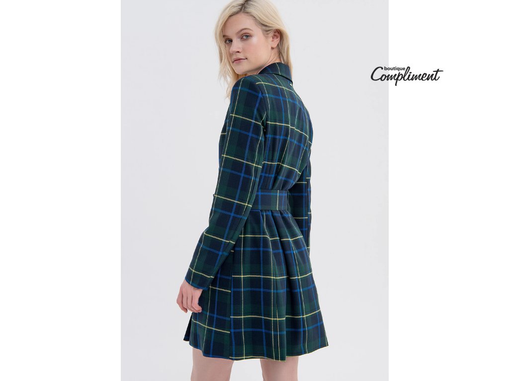 2 v 1!!! Krásné dámské šaty v klasické modro zelené kostce můžete využít také jako přechodový kabát. Dvouřadové zapínání, k přepásání zpevněný široký pásek. Vypodšívkované.