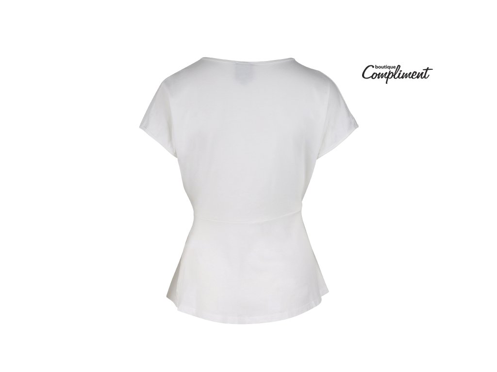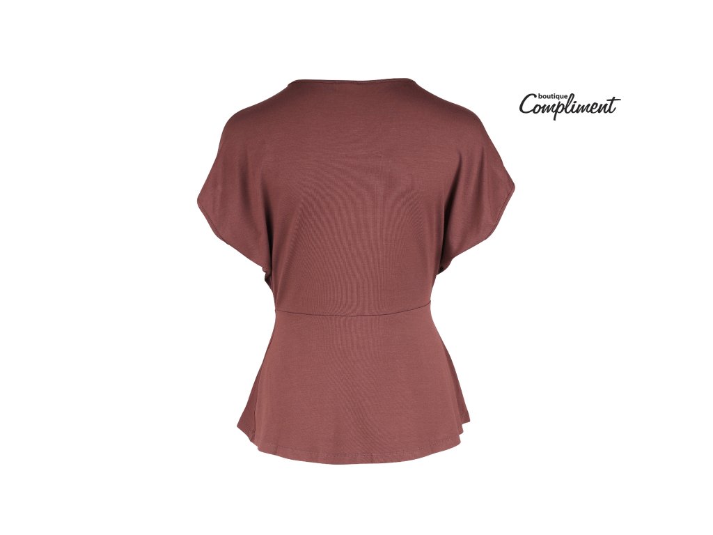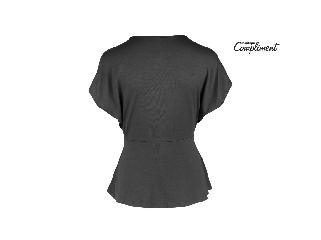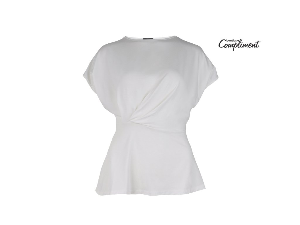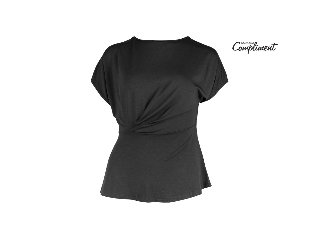 Top se spadlými rukávy je přestřižený v pase s asymetricky vyskládaným řasením vpředu.