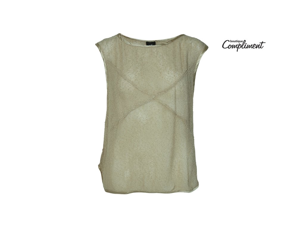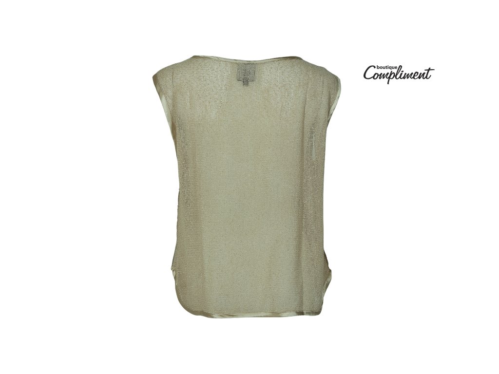Oversize top z jemné síťoviny má oválný výstřih, tvarovanou délku i průramky lemované saténovým proužkem.