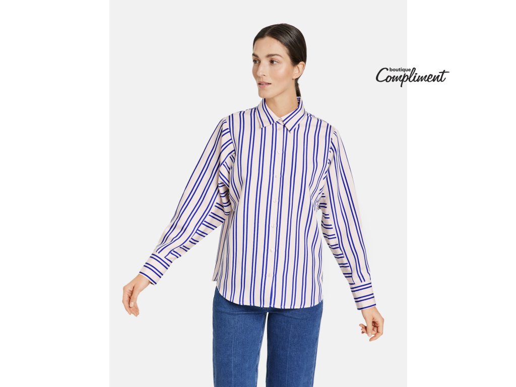 Oversize dámská košile z pevného plátna má klasický košilový límec a manžety na rukávech. Atypicky hluboké průramky rozbíjí různě ložený dvojitý proužek v námořnické modři.