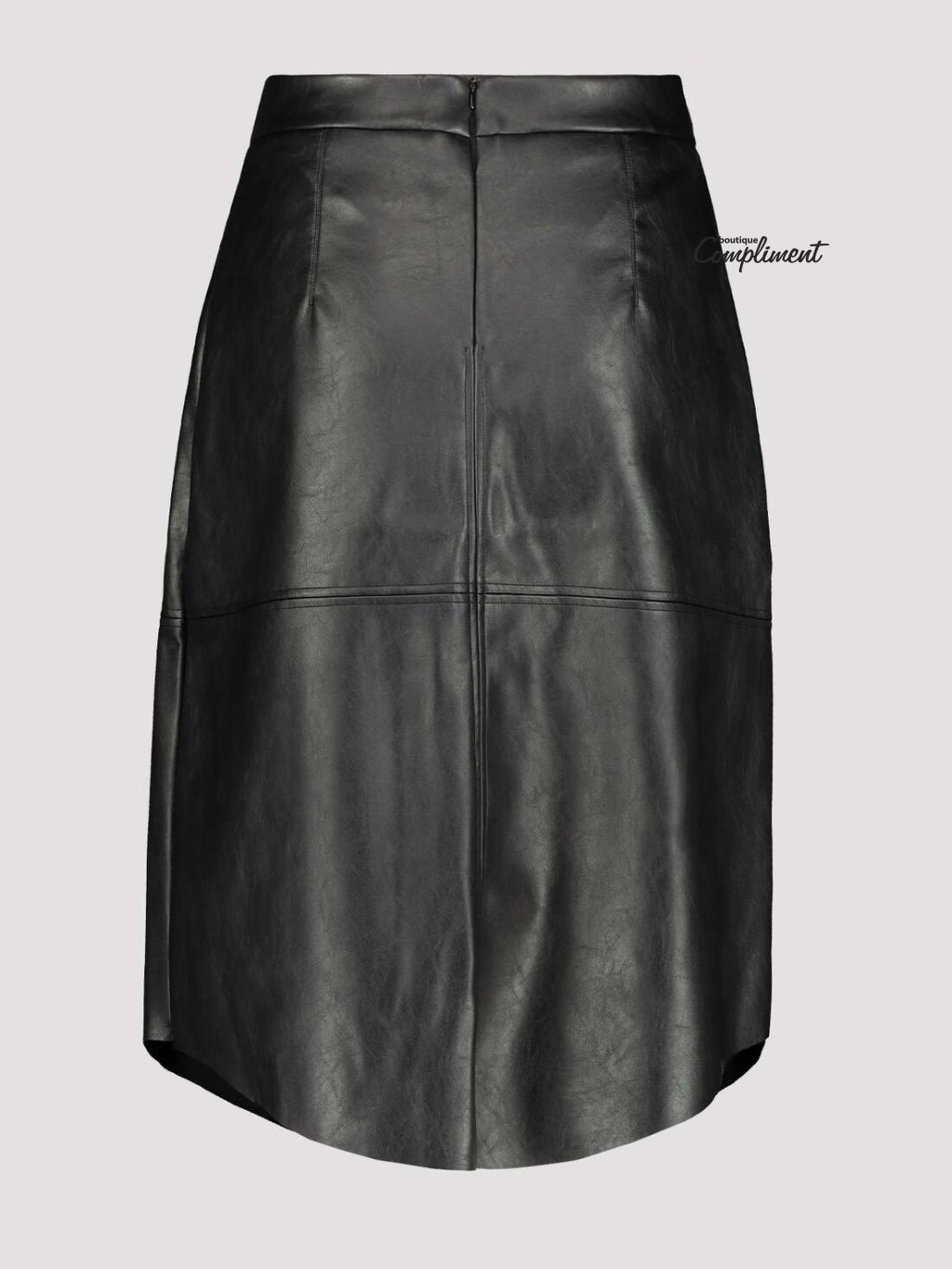 Sukně ze silné eco kůže má kapsy s kovovými zipy v barvě rhodia. Vypodšívkovaná, v délce pod kolena. Vypadá skutečně jako kožená.