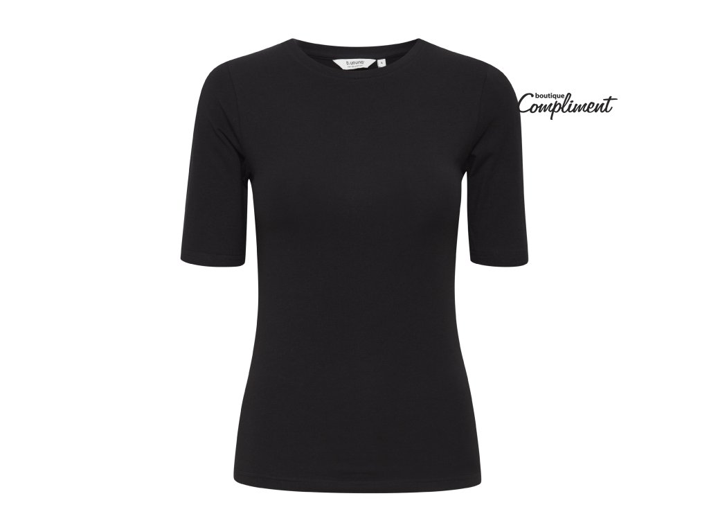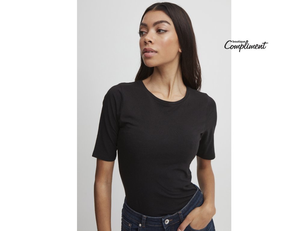 Basic triko s krátkým rukávem má široký žebrovaný lem kolem oblého výstřihu.