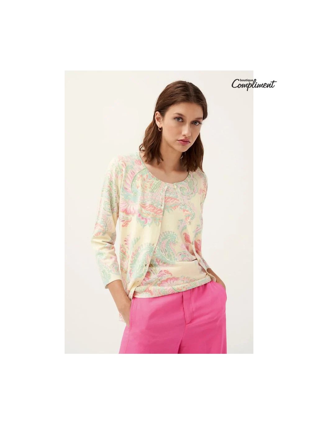 Příjemný propínací svetřík v jemných pastelových barvách - na žlutém podkladu nepravidelný kašmírový vzor. Zapínání na malé perleťové knoflíky.